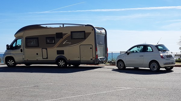Несколько раз встречал подобное: едет такой дом на колесах, а где-нибудь сзади вместо велосипеда приаттачена маленькая машинка - шнырять по окрестностям, а то дом на колесах мало где нормально пристроить можно: на обычных парковках им вставать запрещено. Но я раньше всегда видел, как маленький смартик передними колесами на какую-то платформу поднимается, а здесь такая любопытная сцепка, что "Фиат" всеми четырьмя колесами едет по земле.