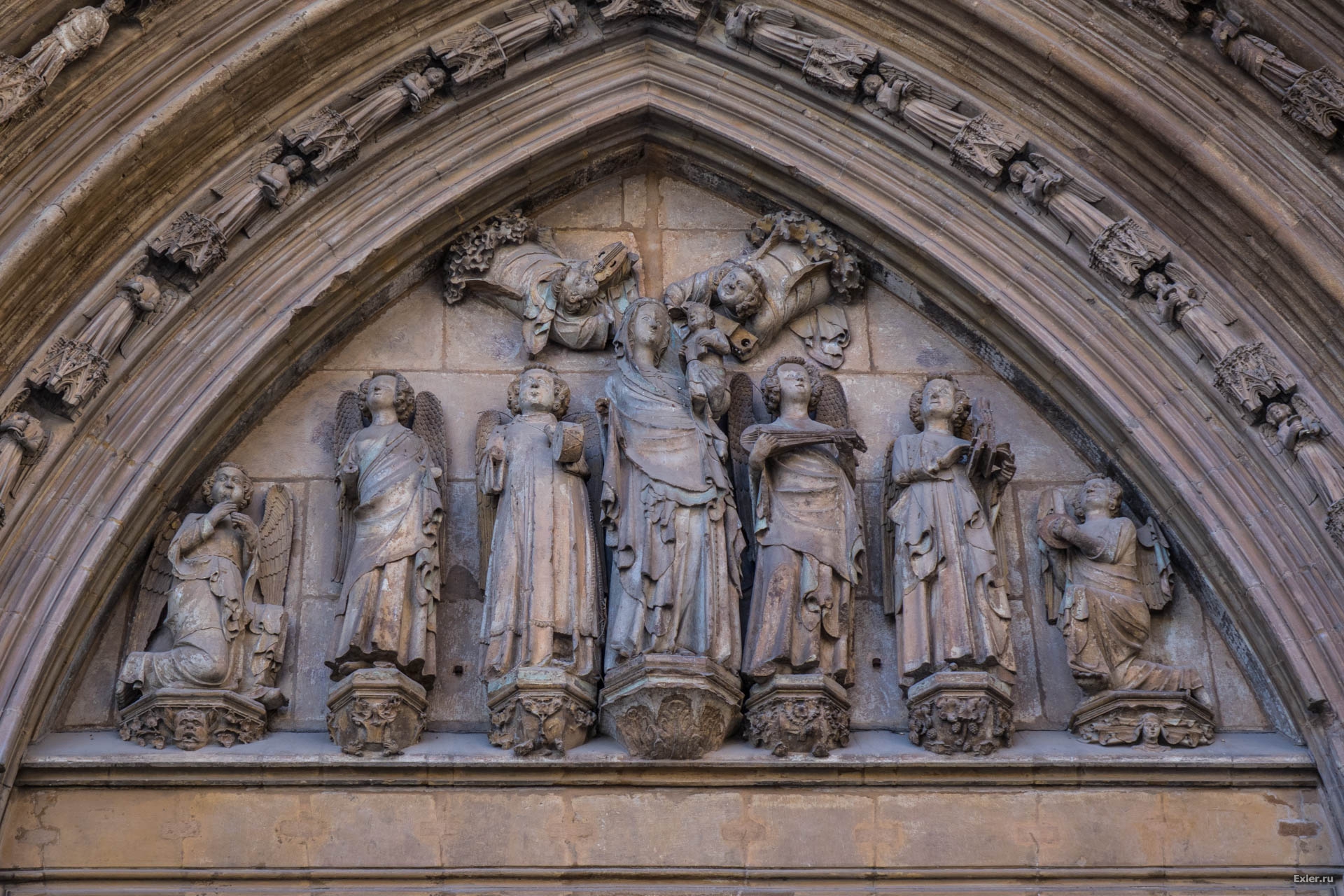В центре, на тимпане портала - фигура Девы Марии с младенцем на руках в окружении ангелов.