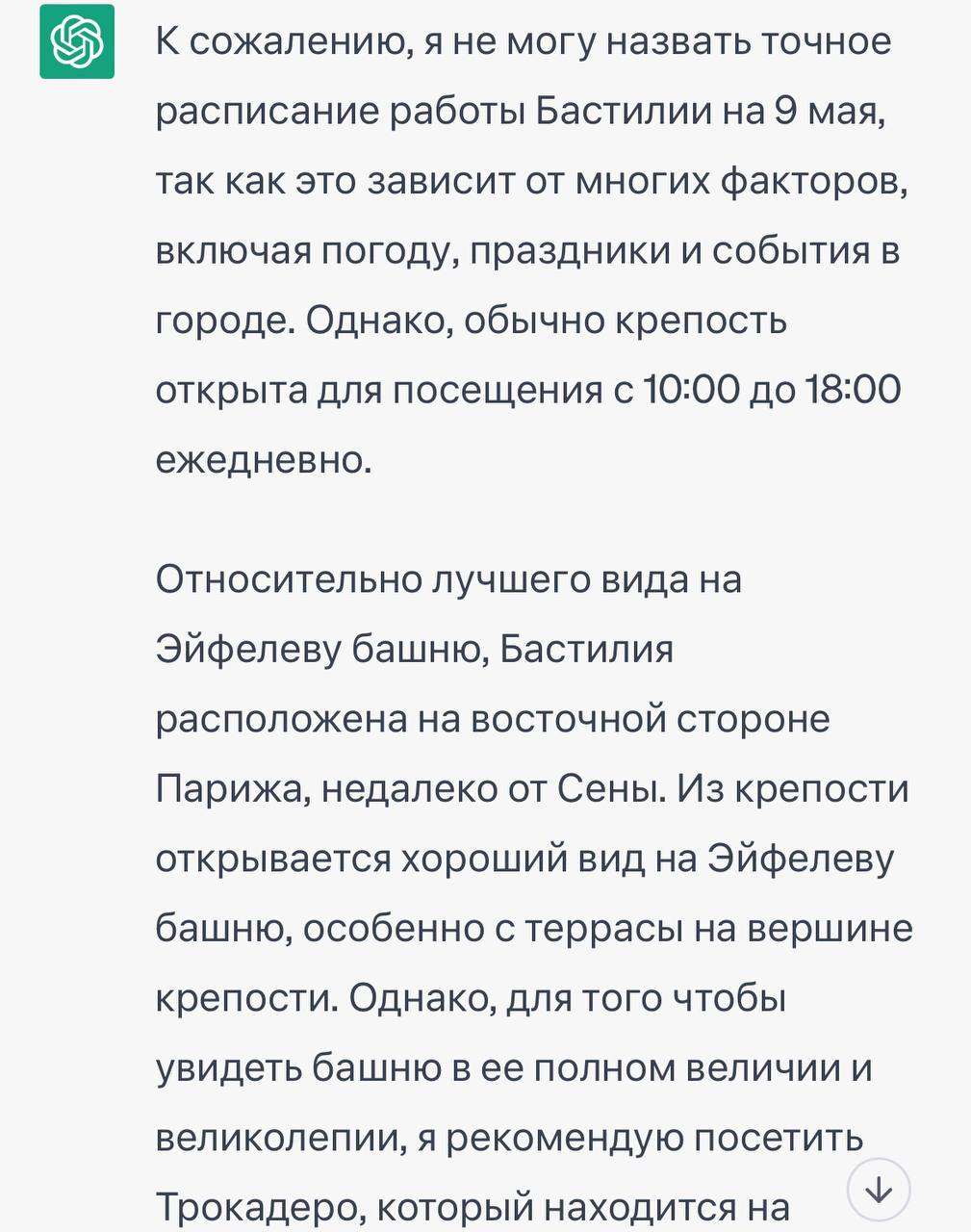 Кстати, если будете в Париже в этот день, не забудьте традиционно посетить Бастилию и покушать на террасе с видом на Эйфелеву Башню. Я там 9 мая был по совету ChatGPT - очень понравилось, советую! Главное - до 18:00 успеть.