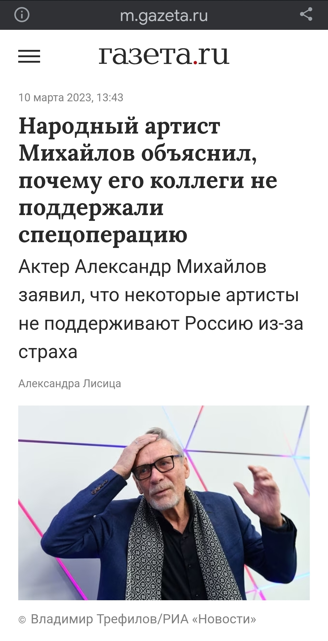 А так... актеру 79 лет, всегда был совковым, вот и не заметил - гэбня подменила совковые ценности на фашистские. Уж не знаю, какие области мозга заблокированы и мешают 2+2 сложить - рф начала агрессивную войну, рф фюрер постоянно лжёт, законности в рф нет, есть феодализм.