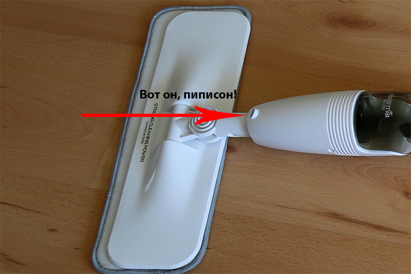 Я сначала думал, что он воду прямо на тряпку подает - ан нет! Когда нажимаете на ручку, он мелко распыляет воду из пиписона, которые виден на фото на корпусе, прямо перед тряпкой. То есть схема работы такая: писнули - протерли, писнули - протерли.