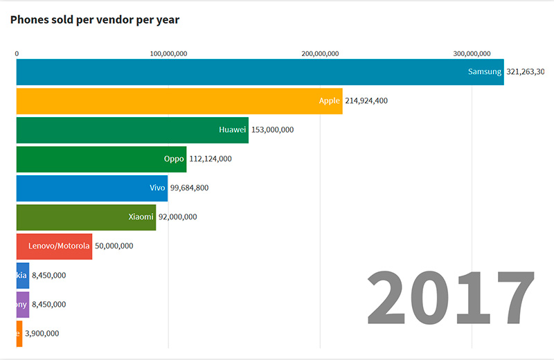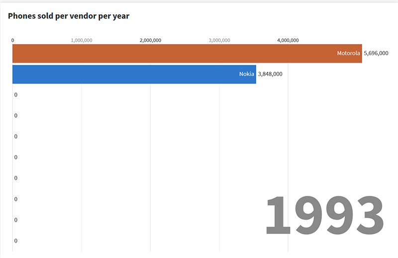 Отличный проект, где в динамике показано изменение соотношений сил на рынке мобильных телефонов. И насколько же быстро все меняется, если каких-то десять лет назад на рынке безраздельно господствовали Nokia и Motorola, а о всяких Samsung и Huawei никто вообще ничего не слышал. Ну и любопытно было увидеть, как Nokia из супермонстра ушла в небытие буквально за каких-то два года. Удивительная история, конечно.
