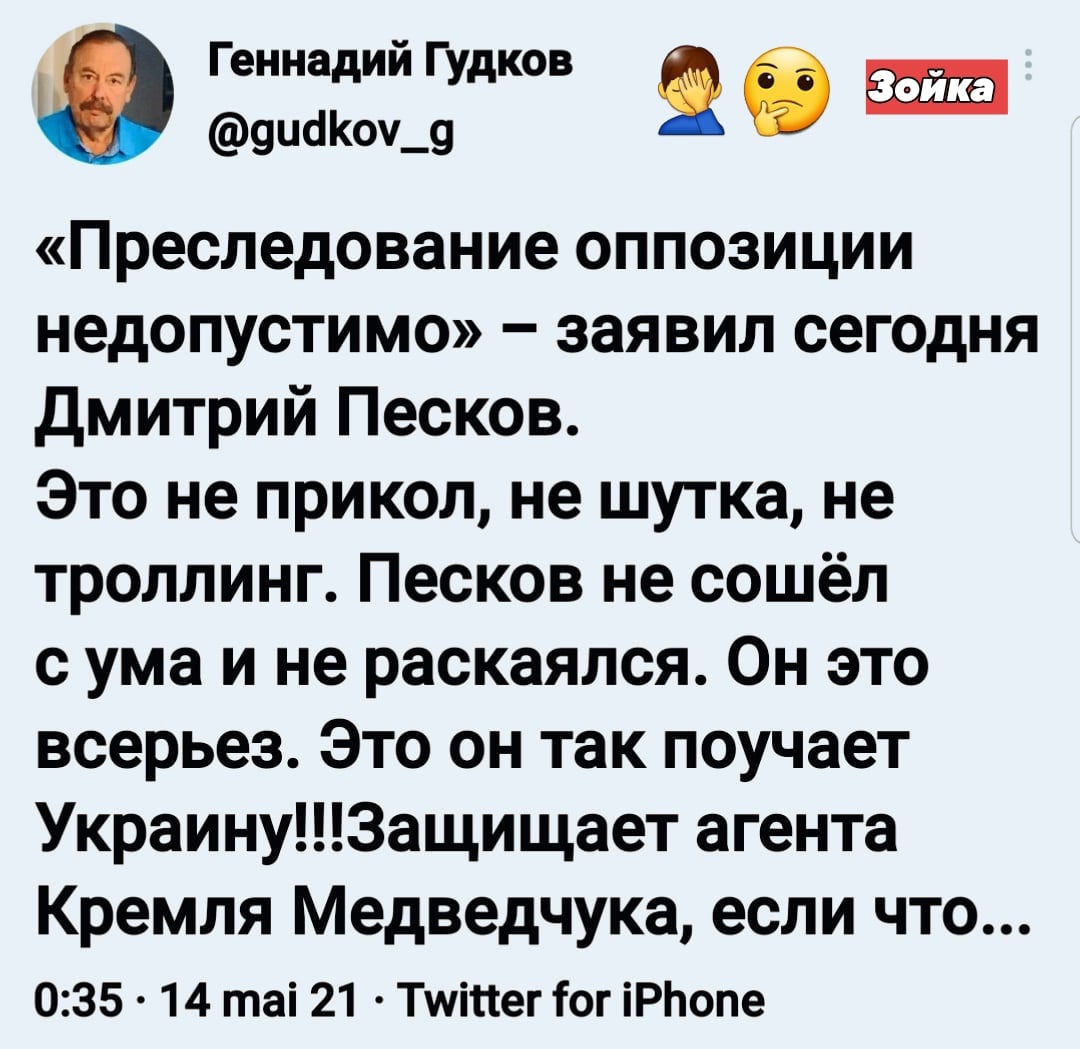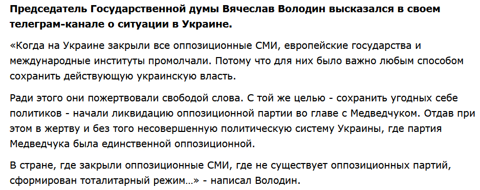 Я удивлен только одному, почему Медведчука не посадили про Порошенко? Его давно пора было посадить или выслать, а его медиа закрыть или конфисковать. Да-да, нарушение свободы слова. Вот только этот принцип не работает, когда страна ведет войну, а медиа работают на противника. Это как если бы в киосках Лондона во время Битвы за Англию можно было свободно купить Фелькишер Беобахтер.