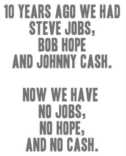 10 лет назад у нас был Стив Джобс, Боб Хоуп и Джонни Кэш. Сейчас у нас нет рабочих мест, нет надежды и нет денег.