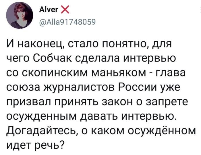 Такштааа... Конкретно в этом плане – совершенно не понимаю и не одобряю какую-то стихийно поднявшуюся "волну" травли Собчак за интервью с маньяком. Тем более, что без этого негативного хайпа многие вообще даже и не узнали бы об этом интервью – а теперь уже точно посмотрят "чисто из интереса" (даже вот сам планирую)). То бишь, все "осуждающие" своими же руками сделали то... против чего сами же и выступали – привлекли максимальное внимание.