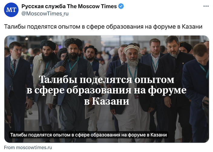 Представители "Талибана", который в РФ до сих пор считается террористической организацией, хотя руководство РФ с этим "Талибаном" целуется в десны, прибыли в Казань на - только не ржите - Форум министров образования стран-участниц БРИКС "Формируя будущее".