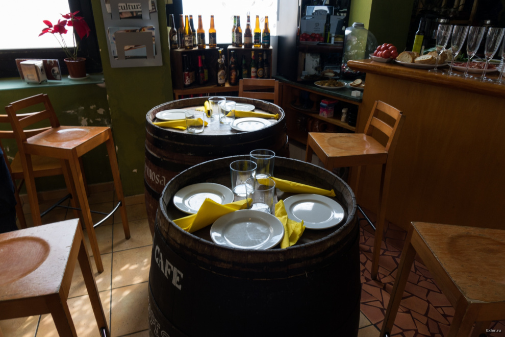 Для нашего мастер-класса вместо столиков были приготовлены бочки из-под вина - это модная тема в Испании, подобные бочки часто можно встретить перед входом в ресторанчики. Правда, за ними никогда не сидят (да и попробуйте посидеть за такой бочкой - поседеете!), за ними стоят, выпивают что-нибудь и клюют что-нибудь, принесенное поклевать (в испанском это так и называется - para picar, поклевать).
