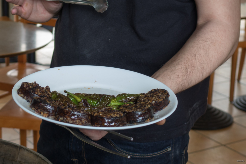 Довольно популярный вид тапасов в Испании - с Butifarra cruda, то есть кровяной колбасой. Выглядит слегка устрашающе, а на вкус - очень даже неплохо. Особенно когда она подается с поджаренным маленьким острым перчиком.