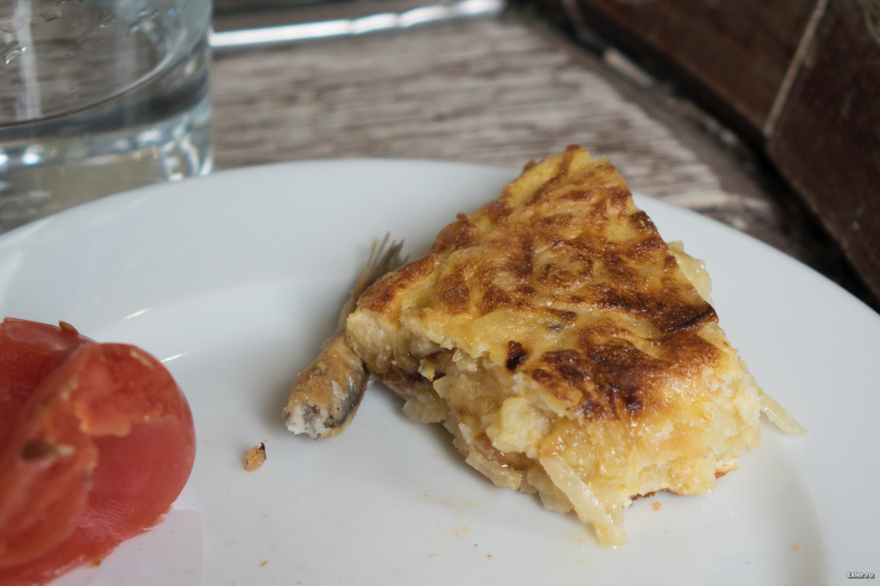 Ну и царица полей - знаменитая испанская тортилья! В Испании тортилья - это нечто вроде картофельной запеканки с яйцами и луком. Или, что тоже самое, нечто вроде омлета с картошкой и луком. Хотя я больше склоняюсь к запеканке: омлет такой толщины не бывает.