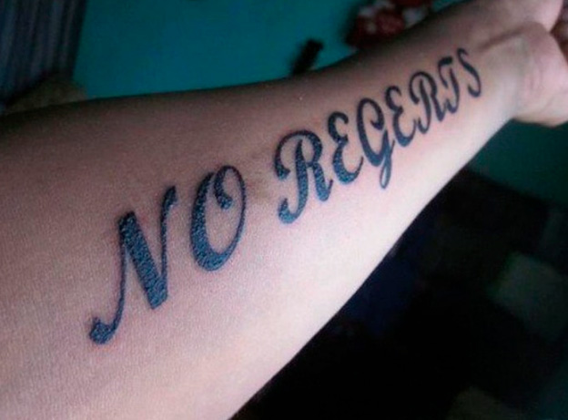 Вот тут чудесное. "No regrets" (без сожалений) превратилось в чудесное "Нет регертсам". Подумаешь, местами две буковки поменял. Зато теперь есть о чем сожалеть.