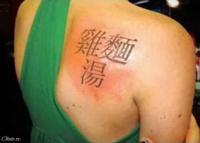 А что имелось ввиду на татуировке? Я в китайском не силён, но похоже на «куриный суп с вермишелью». Кто-то может сказать, там именно это написано?