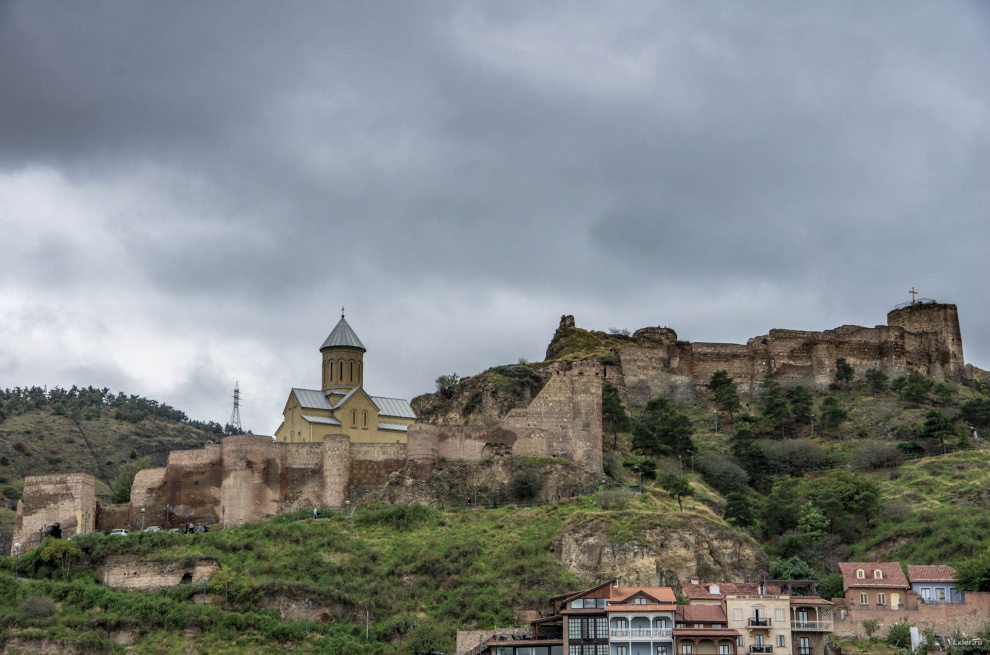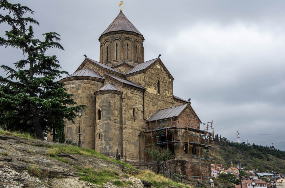 Храм Метехи ( XII век), стоящий на берегу Куры. Крепость и резиденциея грузинских царей. Храм много раз разрушался и снова отстраивался. Сейчас его также реставрируют.