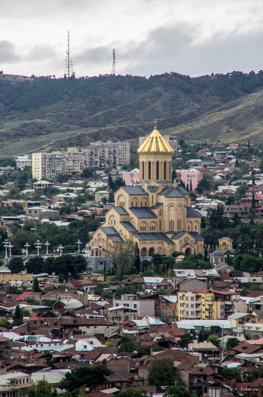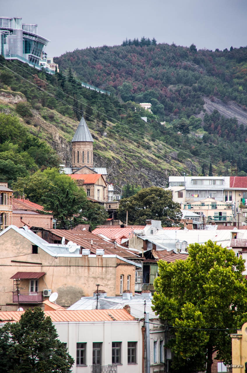 Правее виден знаменитый Храм Сиони - исторически главный храм Тбилиси и один из двух главных в Грузинской церкви; назван в честь Сионской горы и освящён в честь Успения Пресвятой Богородицы. До открытия Собора Святой Троицы здесь находилась кафедра католикоса Грузии.