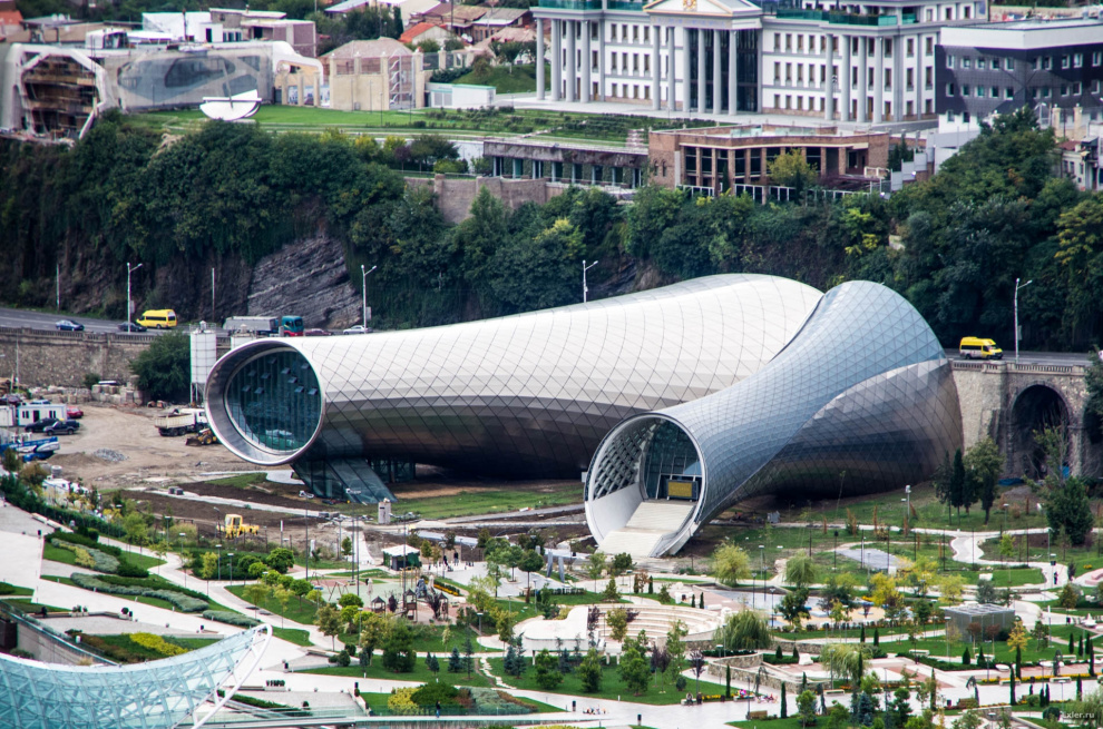 Вид сверху на президентский дворец, под которым - причудливые строения суперсовременного концертного зала, который также строился по инициативе Саакашвили. Достроить концертный зал не успели, ну и новые власти строительство остановили, хотя комплекс почти готов. Многие считают, что эти две трубы, как и мост-"прокладка", сильно портят вид города.