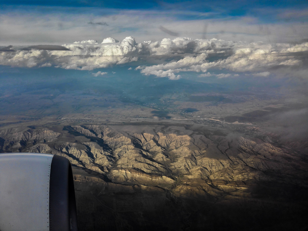 Шириком снято. В лайтруме поправлено, немножко цвета, немножко драматизма, вот так и получилось. Единственно, иллюминатор сильно был загажен - черные макароны в верхней части облаков как раз от него.