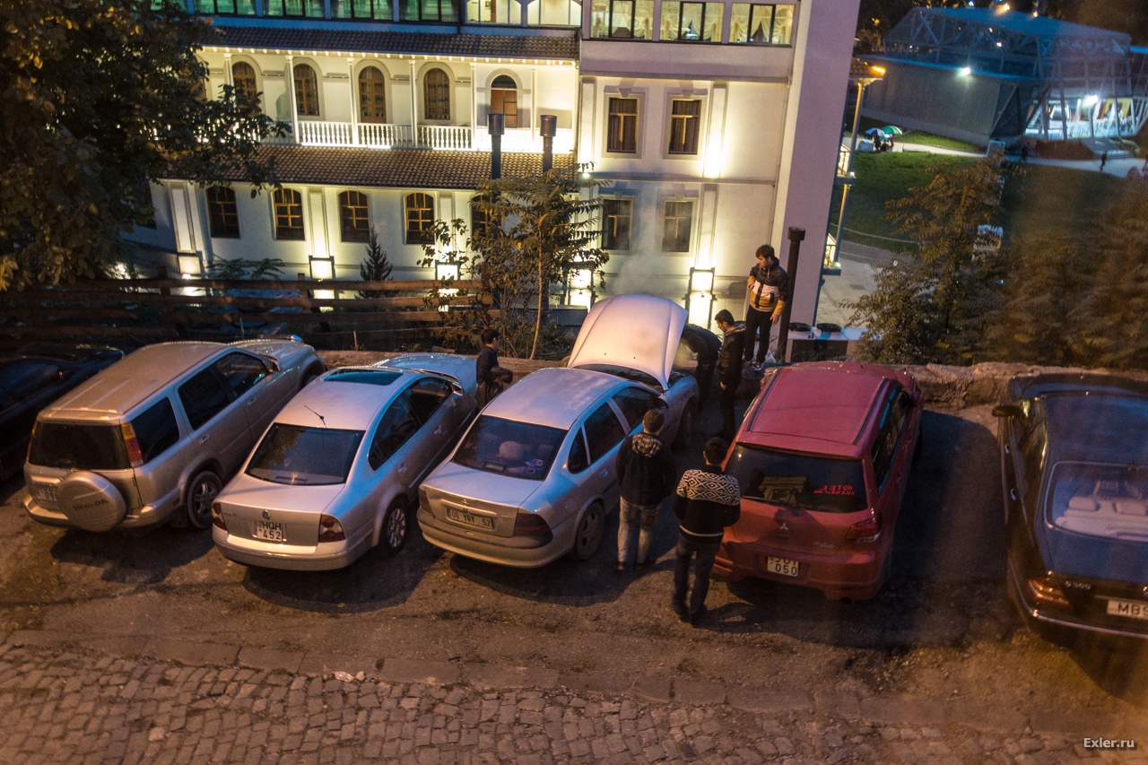 Заселился в номер. Пока разбирал вещи - за окном человек десять мужчин командовали водителем машины, которая должна была припарковаться между другими двумя машинами. Чего там было командовать - не очень понятно, места было полно, но командовали они долго. Потом машина от напряжения закипела, так что мужчины открыли капот и стали заниматься автомобильной диагностикой. Минут через двадцать, когда мы выходили из отеля, они все так и диагностировали, хотя ряды мужчин заметно поредели.