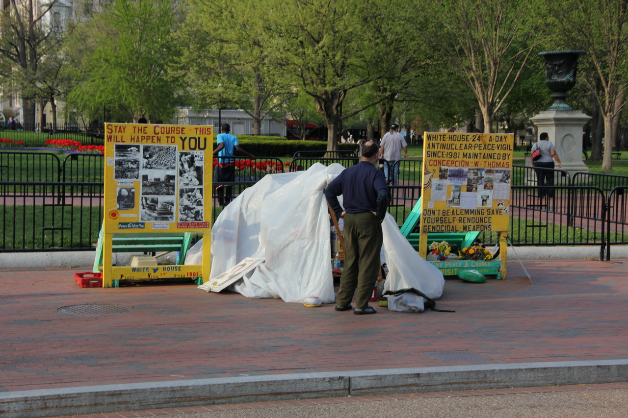 Палатка той самой сумасшедшей тетки, которая с 1981 года сидит напротив Белого Дома и протестует против войны. Всякой разной.