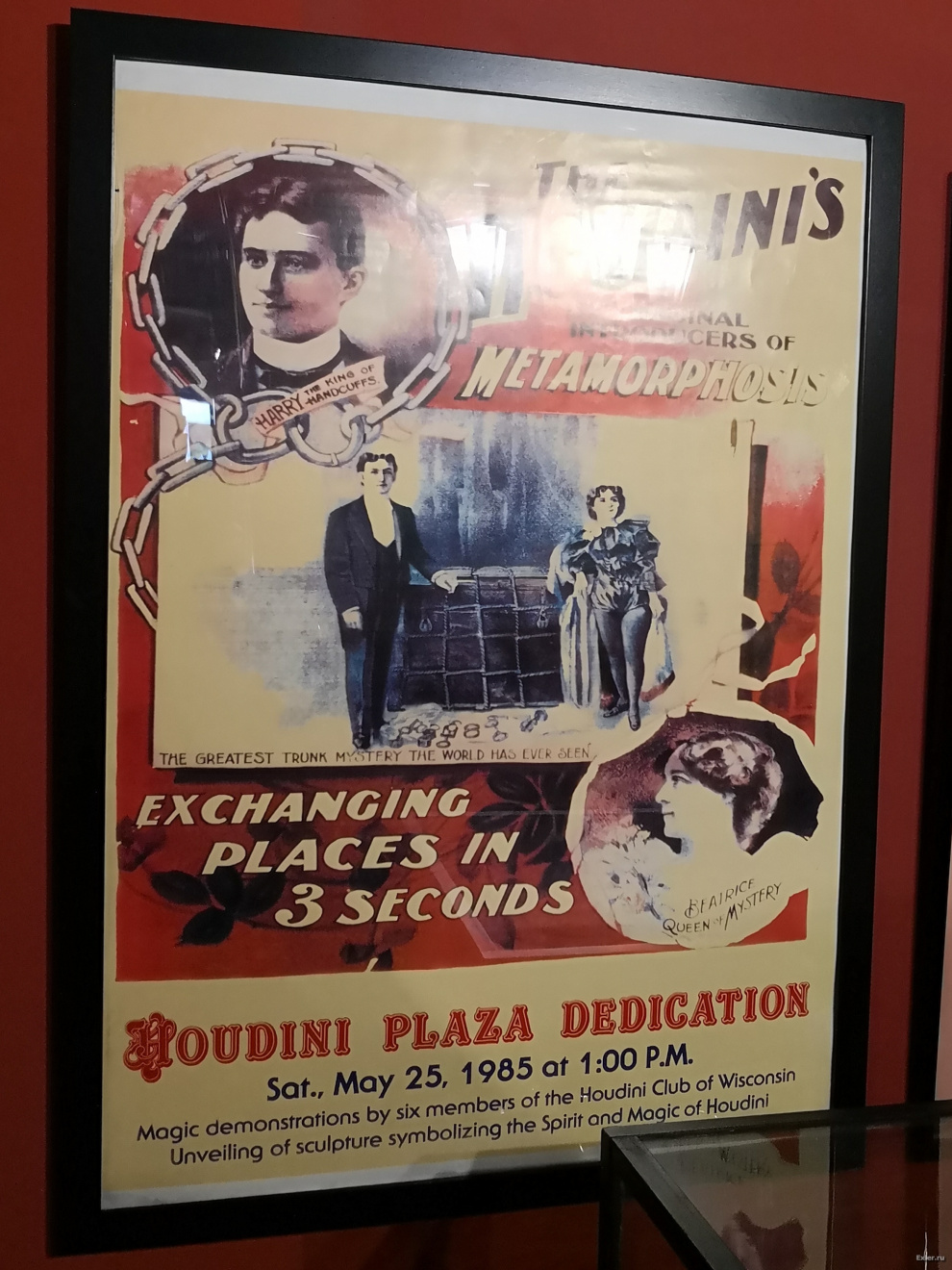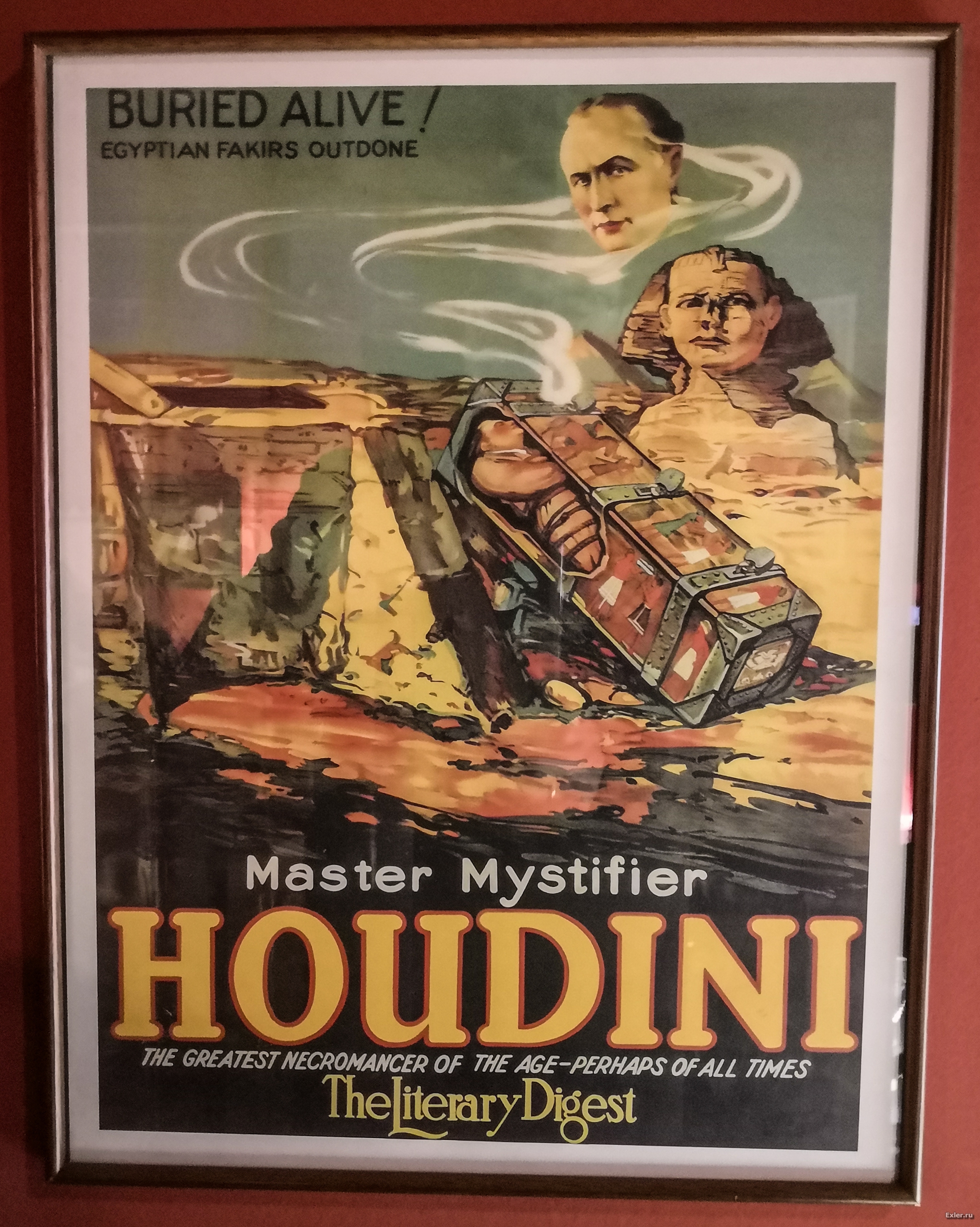 Это вообще суперратитет - подлинные афиши выступлений великого Гарри Гудини. Его заковывали в цепи, помещали в смирительную рубашку, закрывали в ящике, который также закрывали на стальные замки - он все равно выбирался. Не сработал у него только номер, когда этот ящик еще и закапывали в землю - вот тут самостоятельно выбраться он не смог.