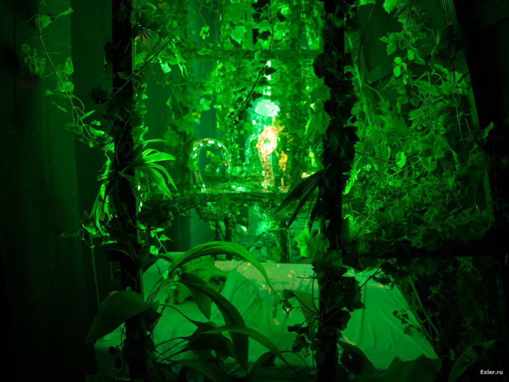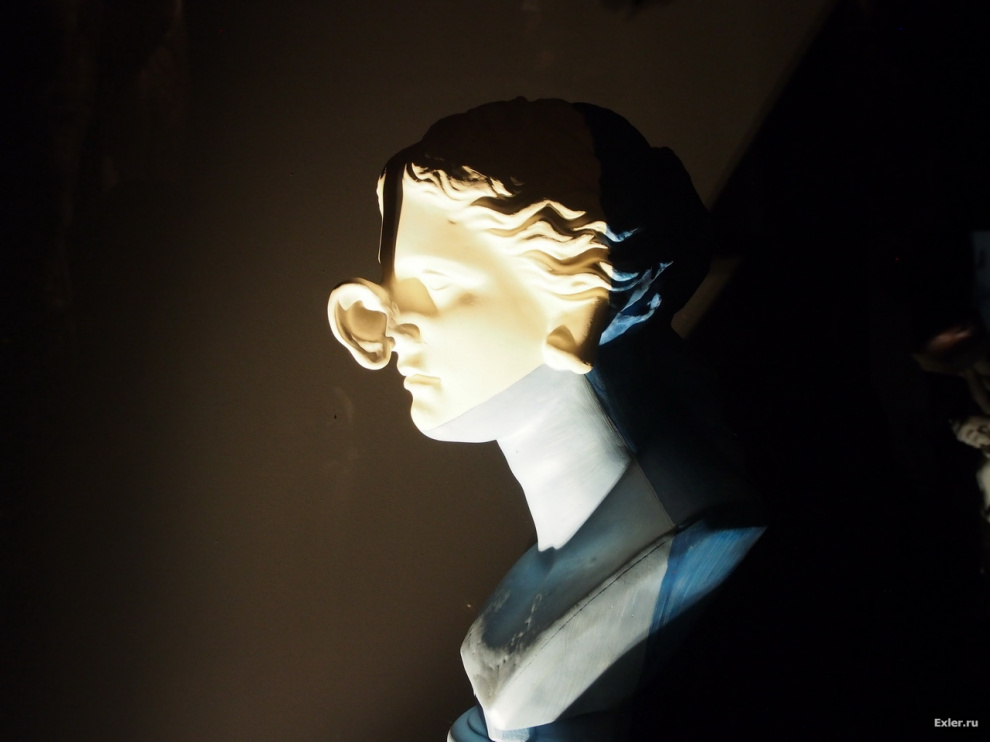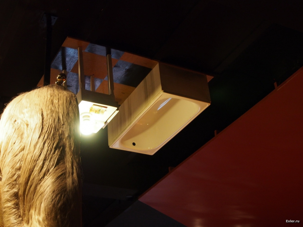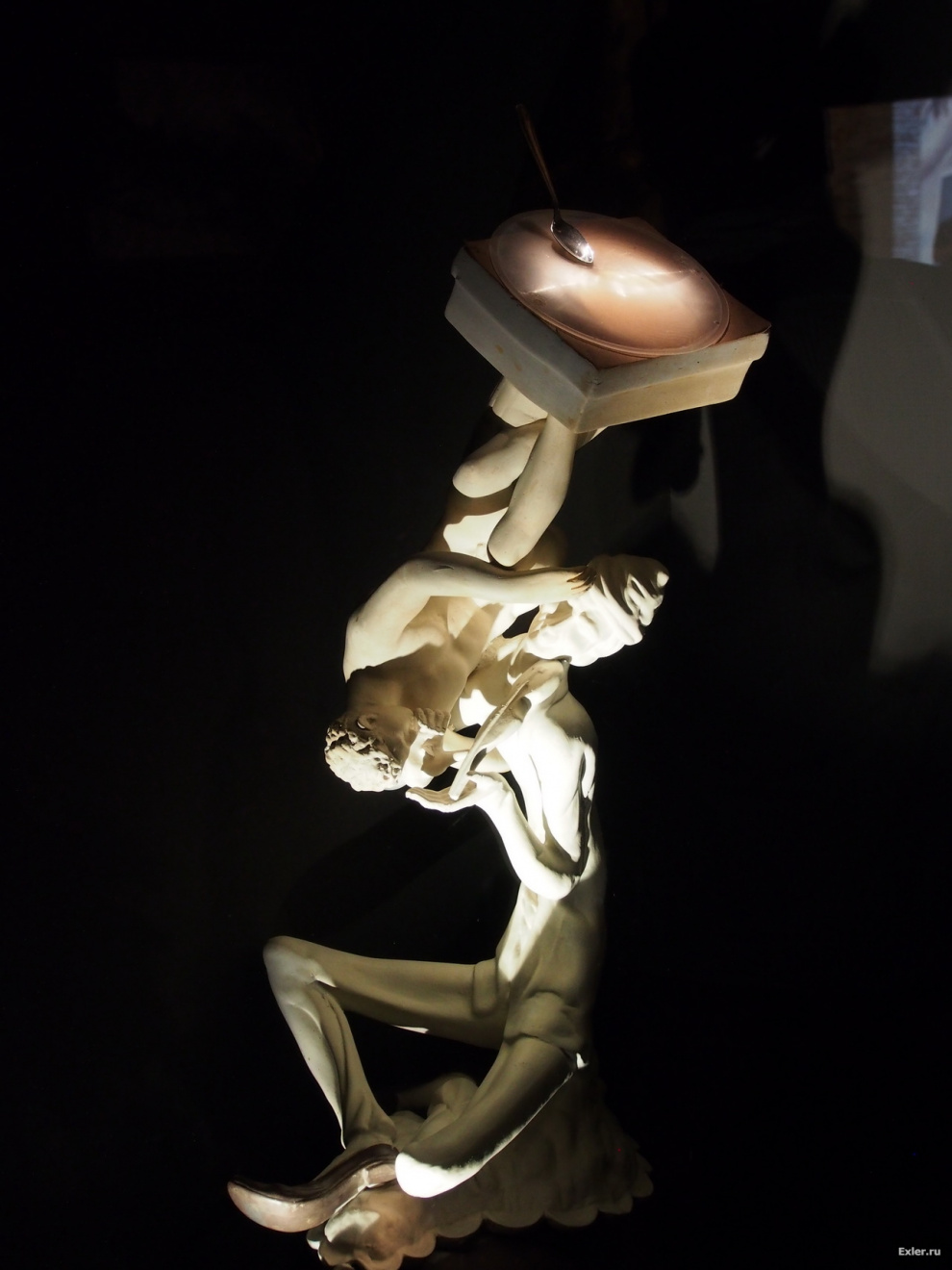 В этом зале было еще несколько интересных инсталляций. Вот это, например, Прометей прикованный к скале и закованный в стул. Кстати, хорошая демонстрация работы стабилизатора Olympus OM-D E-M5: там освещения практически не было, снимал с рук выдержкой в одну секунду. Вон чья-то рука с телефоном там треки оставляет.