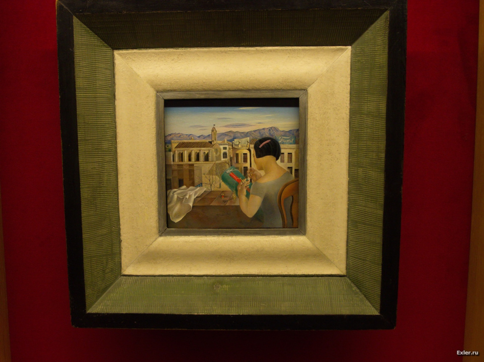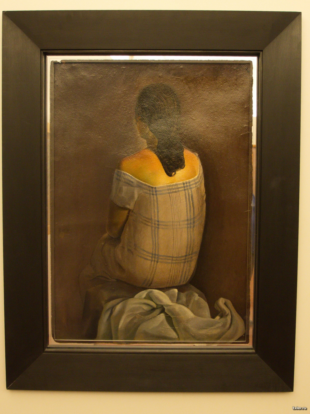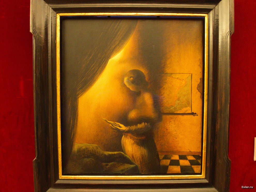 Это знаменитая картина под названием "Исчезающие образы". Она как бы копирует работу Вермеера Дельфтского (девушка, читающая письмо), но если приглядеться, то картина складывается в профиль Веласкеса.