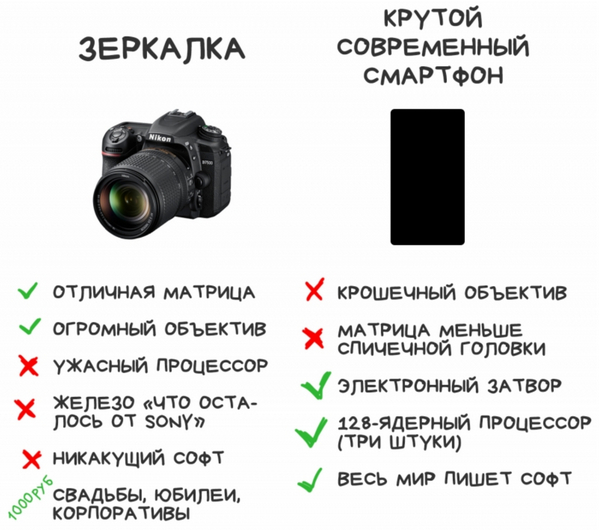 По поводу картинки в посте с преимуществами и недостатками зеркальных камер и телефонов: