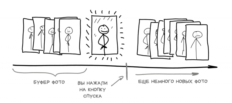 Вещь, о которой многие не задумываются, но она важна для понимания всей мобильной и вычислительной фотографии: камера в современном смартфоне начинает делать фотографии сразу, как только вы открываете ее приложение. Что логично, ей ведь надо как-то передавать изображение на экран. Однако, помимо экрана, она сохраняет кадры высокого разрешения в свой собственный циклический буфер, где хранит их еще пару секунд.