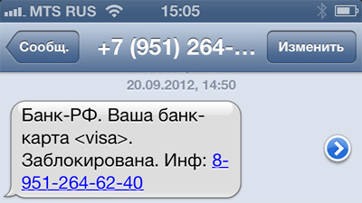 Жене пришло на телефон. "Банк-РФ" и "банк-карта" - это прекрасно звучит, конечно. Еще лучше "Заблокирована" в качестве отдельного предложения. Прям монументально. А в чем разводка, кстати? В том, что звонок на этот номер - сильно платный, я так понимаю?