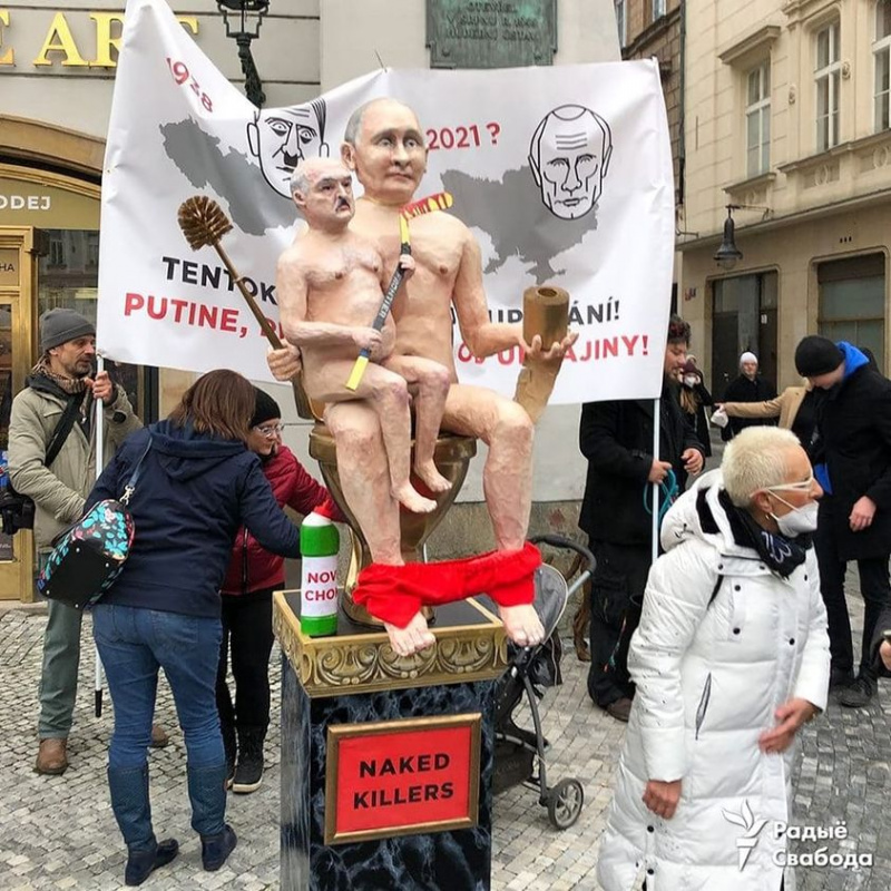 Ваш пример, изображения буржуев и капиталистов, был все таки частью государственной пропаганды для своего же населения. Акция с голыми Путиным и Лукашенко, это скорее просто политическая акция, которая троллит два похожих авторитарных режима. Ну и намекает на зависимые отношения Лукашенко и Путина. Скорее всего это устроили русскоговорящие эмигранты, так как не особо верю что чехи особо переживают за политический строй в РФ и Белоруссии. Ну и конечно тут же не троллинг некой группы людей, как "буржуи и капиталисты", а именно двух конкретных людей.