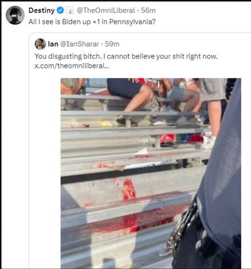 Некто Дестини, комментируя фото трибуны, залитой кровью одного из зрителей, закрывшего собой семью и погибшего от пули стрелка, пишет: "Все, что я вижу, это плюс один Байдену в Пенсильвании." И далее, на втором скриншоте: "Кто-то в толпе, поддерживающей и приветствующей предателя этой страны поймал случайную пулю? Ой, так грустно, я вас умоляю..."