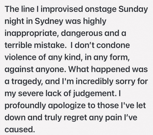 Кайл Гасс в своим Инстаграме принес извинения за эту дебильную шутку, написав:  "Шутка, которую я сымпровизировал на сцене в воскресенье в Сиднее, была крайне неуместной, опасной и ужасной ошибкой. Я не одобряю насилие в любом виде, в любой форме, в отношении кого бы то ни было. То, что произошло, было трагедией, и я невероятно сожалею о том, что у меня не хватило рассудительности. Я приношу глубочайшие извинения тем, кого я подвел и искренне сожалею о боли, которую я