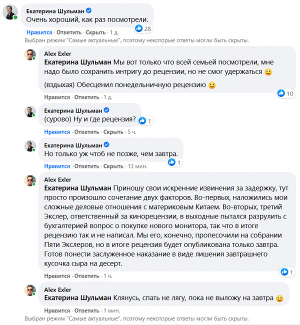 Фейсбук сортировать ответы по времени написания не умеет. Ну, понятное дело, чай, не Exler.ru...