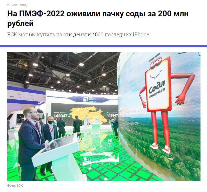 «Башкирская содовая компания» — производитель соды в легендарном красном дизайне, решила поучаствовать в Петербургском международном экономическом форуме (ПМЭФ-2022). Главная экспозиция компании — интерактивный экран с живой пачкой соды, который обошелся в более 200 млн рублей.