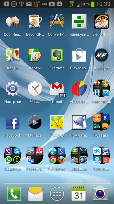 Вот мой десктоп на Note II. В принципе, можно слегка поджать строчки и сделать еще и шестую строку пиктограмм - места хватит. Однако меня и так устраивает, а кроме того, пусть десктопы у Note II и S III будут совершенно одинаковые.