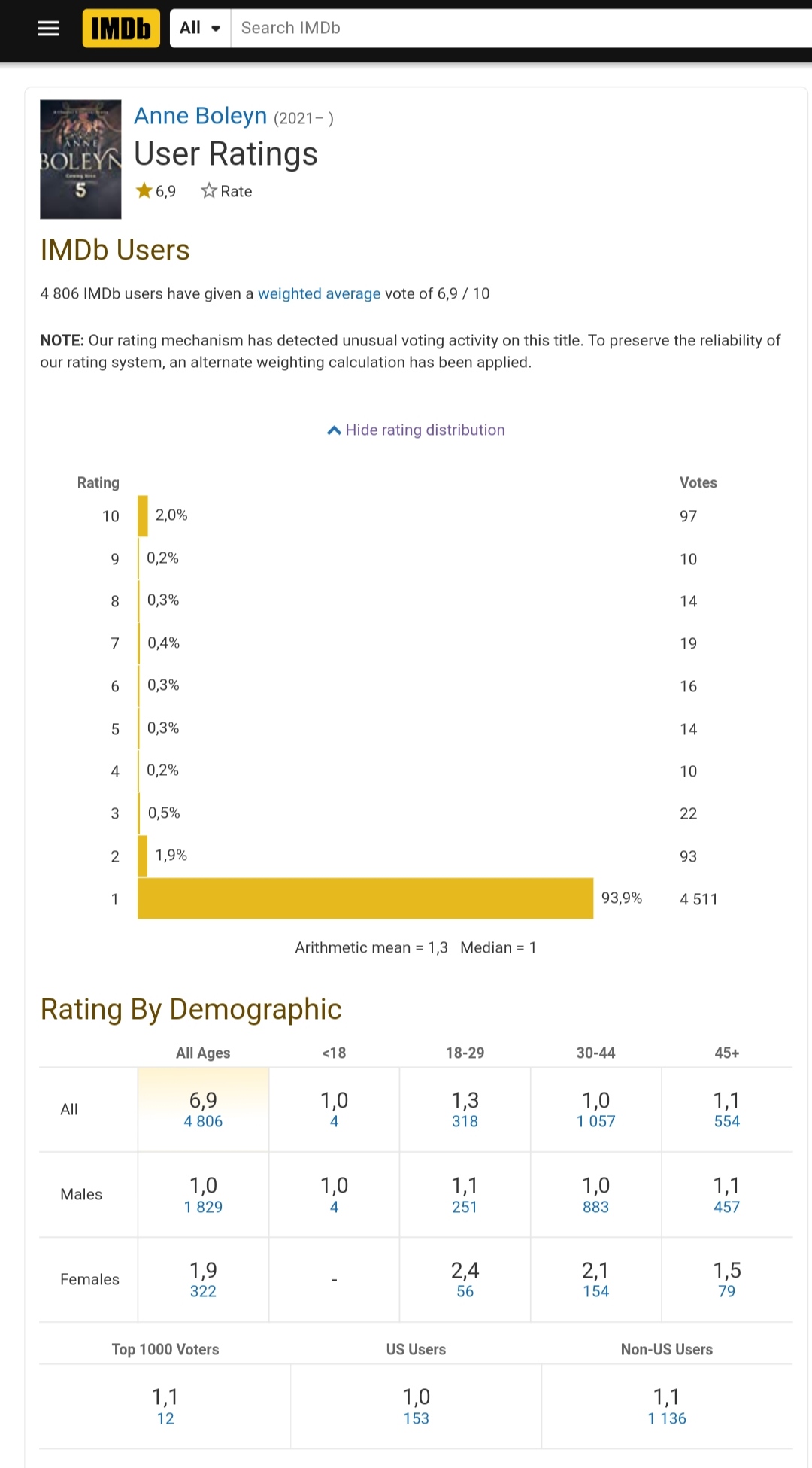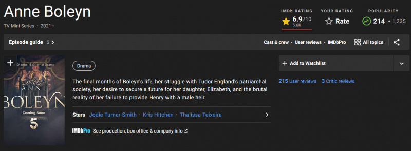 Только я написал о сверхнизком рейтинге сериала "Анна Болейн", как на IMDB исправились.