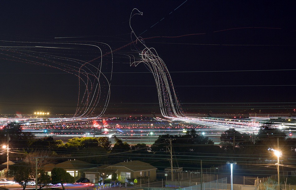 По моему скромному разумению, самолеты обычно не взлетают и садятся навстречу друг другу (даже если разные ВПП). И то, и другое - следы взлетов, а прекращается след в момент выключения "фар". Садятся - с другой стороны (за спиной фотографа).