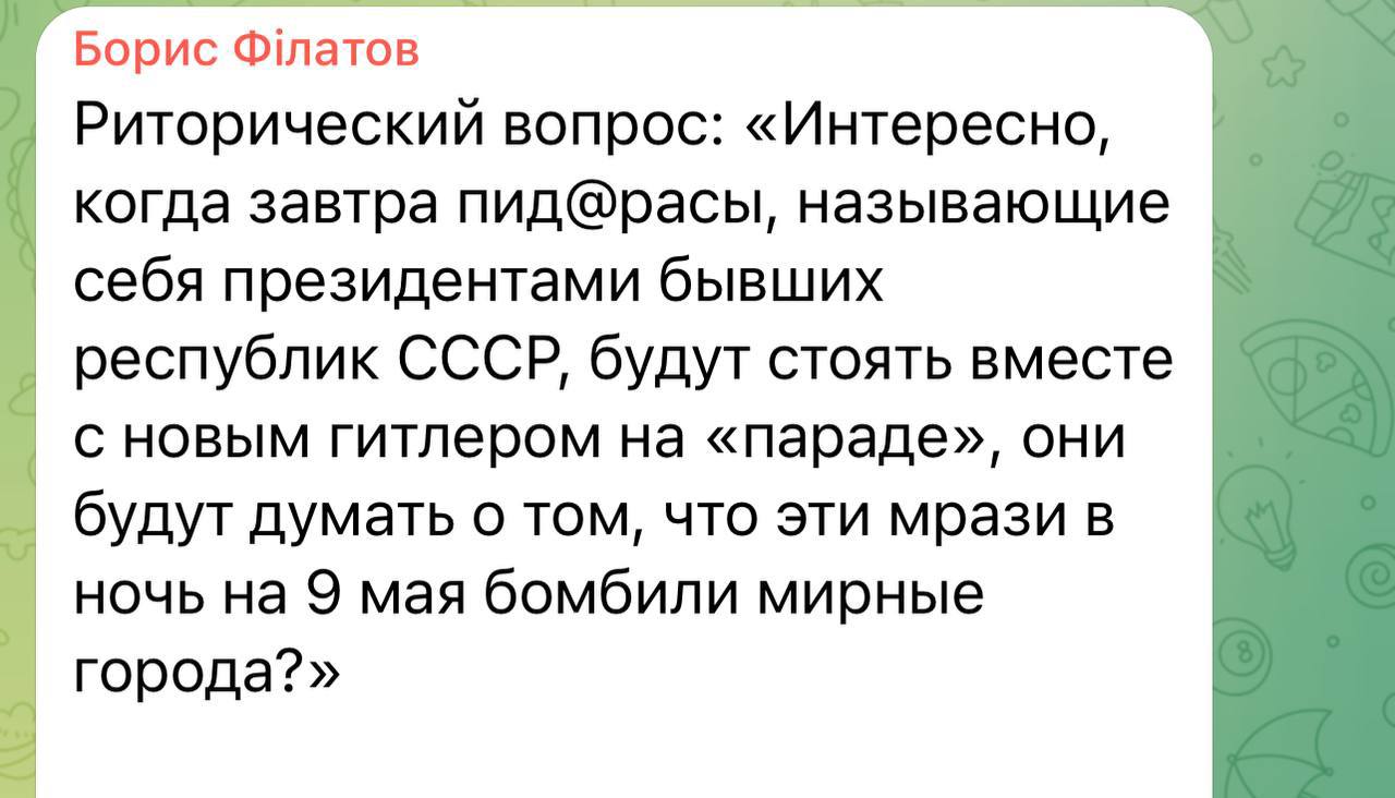 Все эти парады, как я уже сказал выше, не более чем потрясание дряхлыми военными яйцами, в день того, чего нет. Победы нет, есть поражение с полной капитуляцией перед фашизмом и радостное раздвигание булок целого государства расия, самостоятельно и с радостью налезающего на эту фашистскую иглу. И этот самый символ победы, для некоторых которая пишется якобы с большой буквы, это всего лишь один из шагов в геноциде мирного населения соседнего государства - Украины и офашиствования расии. Такое дерьмо недостойно чтобы его осакрализировать особенным написанием.