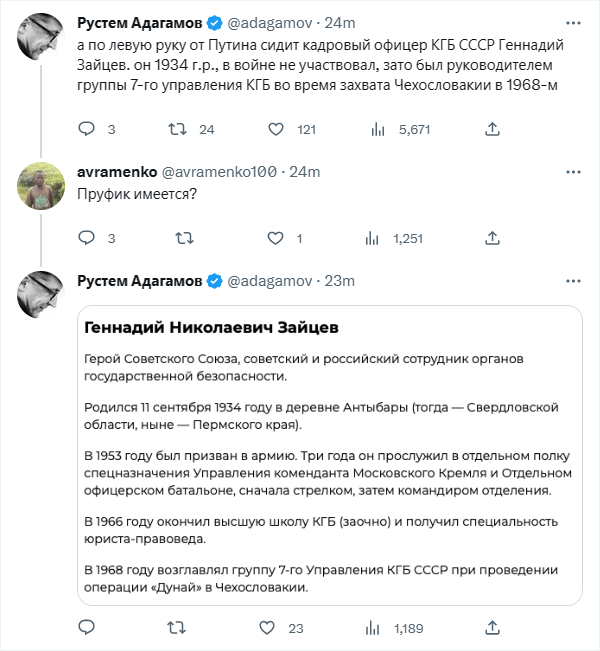 А теперь скажите: как вы думаете, случайно ли Путин, убивающий сегодня мирных людей в Украине, посадил по правую руку от себя именно Юрия Двойкина?