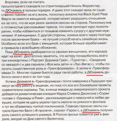 Но когда они Josh Duhamel в одной статье почему-то везде именуют ДЮхамель (именно так, с двумя заглавными буквами, как будто у них CapsLock заело), а потом почему-то Дюамель, когда он на самом деле Дюмэл (я специально рылся и искал, но так как результаты были неоднозначные, в конце концов просто нашел, как его произносят на экране в Штатах - вот) - это уже вообще на уровне "МК-Бульвар", которым вообще пофиг, как и что писать. Удивительно. Так почему ДЮ-то? Он что - Дмитрий Юрьич Хамель?