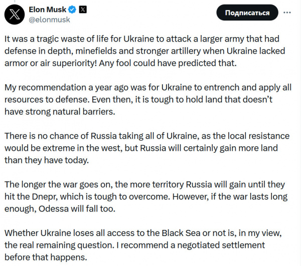Даже страшно представить, что бы Украина делала без ценных советов Илона Маска, просто страшно представить!