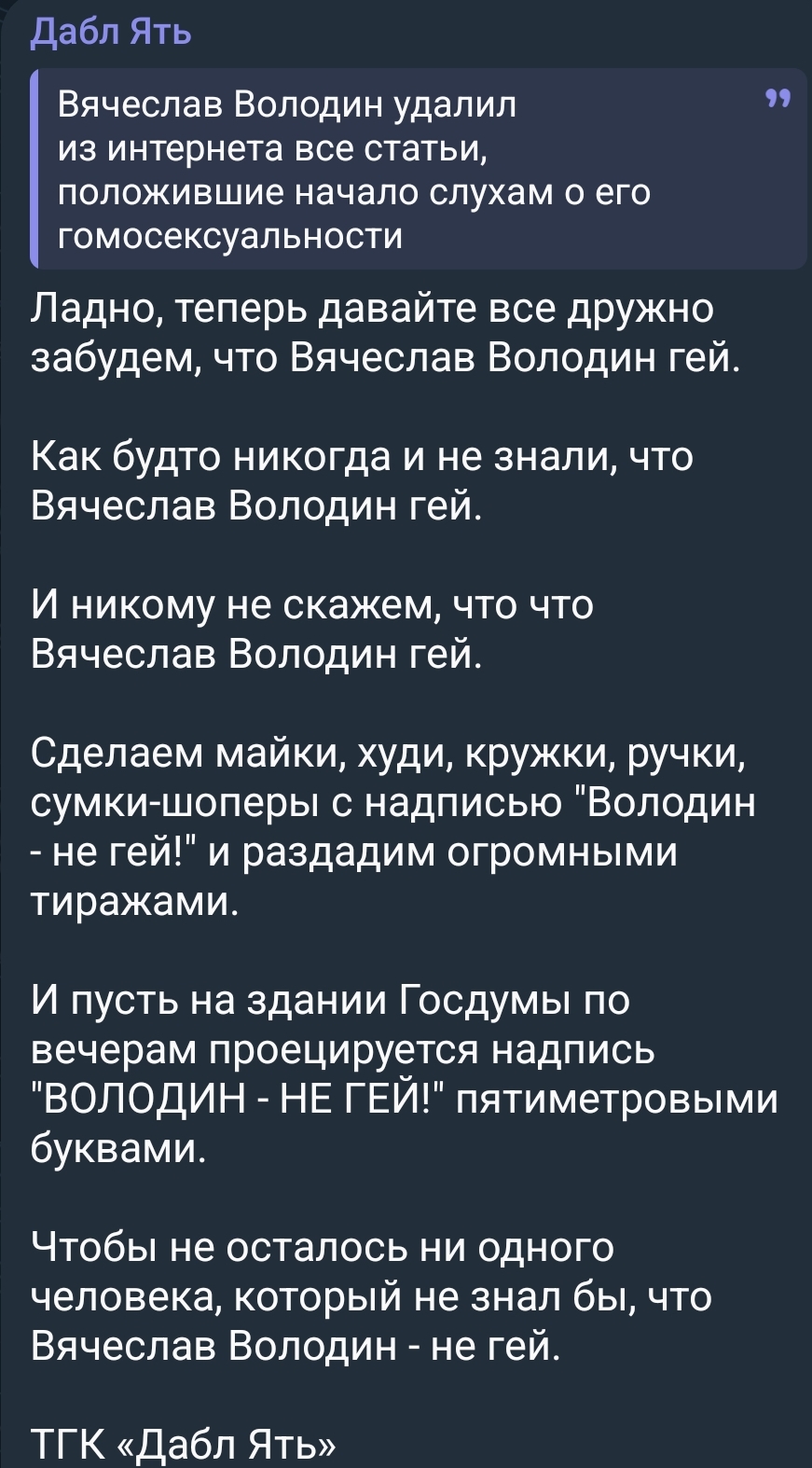 «А вы поглядите, с чего началось разрушение Советского Союза? Еще во времена ЦК КПСС, в 1989-м году, вышел фильм „Интердевочка“. Все рукоплескали. Очереди в кинотеатр. Секретари ЦК ходили, смотрели. Итог — страны не стало», — заявил Володин.