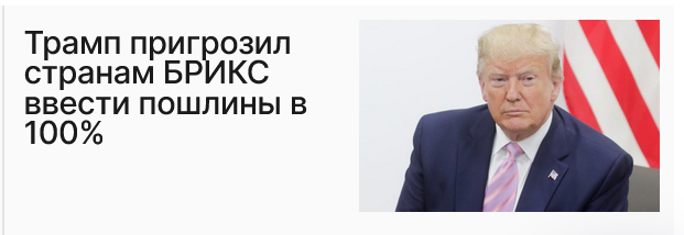 Трамп вдруг озаботился тем, что страны БРИКС типа как собираются ввести свою валюту для международной торговли. Болтовня об этом идет давно, но вообще введение подобного очень маловероятно - по многим причинам. Но Трамп вчера вдруг озаботился, и сказал, чтобы они там заканчивали разводить разговорчики в строю, а то сейчас сразу всем отвыкнет.