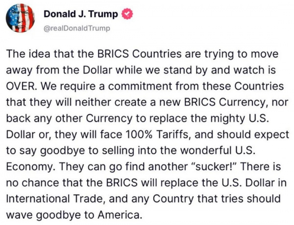 "Мысль о том, что страны БРИКС пытаются уйти от доллара, пока мы стоим и наблюдаем, исчезла. Мы требуем от этих стран обязательства не создавать новую валюту БРИКС и не поддерживать никакую другую валюту, чтобы заменить могучий доллар США", - написал Трамп, добавив, что в противном случае страны "столкнутся со 100%-ными пошлинами".