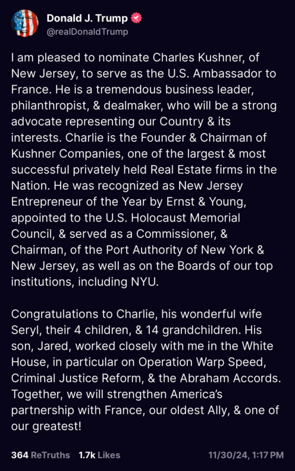 Трамп продолжает формировать свою команду. После предложения ведущего Fox News Пита Хегсета на должность министра обороны, крайне правого конгрессмена Мэтта Гетца, которого подозревали в секс-торговле, на должность генерального прокурора, а также предложение антиваксера (там за ним вообще большой шлейф всякого разного тянется) Роберта Ф. Кеннеди-мл. на должность министра здравоохранения, теперь возникла еще одна изумительная кандидатура - правда, всего лишь на должность посла США во Франции.