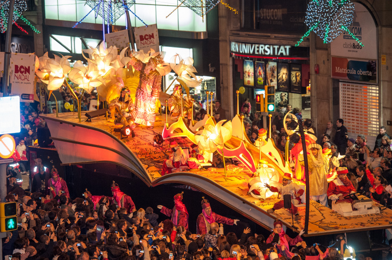 В Барселону пришли Три Короля - это один из главных праздников года, Tres Reyes Magos. В России их называют волхвами, которые предсказали рождение Иисуса Христа и пришли ему поклониться, принесли всякие дары, как гласят СМИ тех времен. Королей зовут Каспар, Мельхиор, Балтасар.