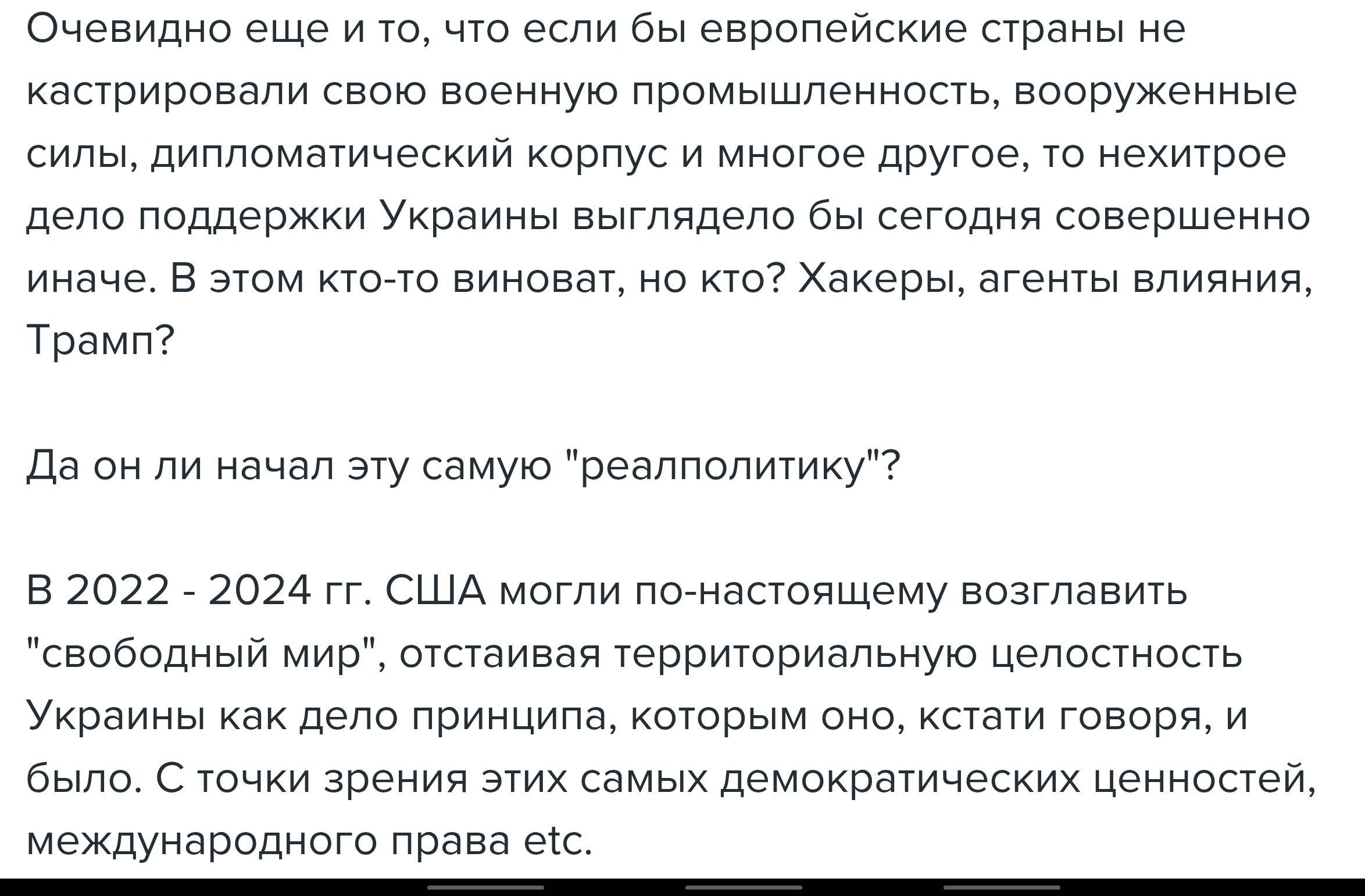 Более того, у меня есть стойкое ощущение что НАТО не вмешается даже если пу нападет на страны Балтии. Трамп при этом еще заявит - вот я же говорил что надо увеличивать военный бюджет в странах Европа, вот теперь сами и разбирайтесь. Собственно говоря НАТО это более чем виртуальная нынче организация, как и ООН, только о том что ООН виртуальная и не очень нужная контора говорят уже сегодня, а о том что НАТО фактически не работает будут говорить завтра.