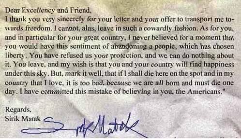 Письмо начальника штаба армии Камбоджи Сирик Матака американскому послу Джону Гантеру Дину.