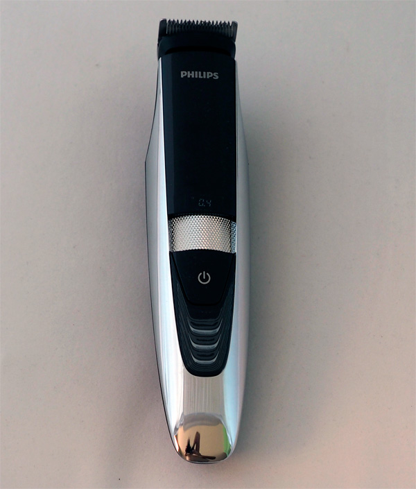 Из особенностей - у триммера есть колесико тонкой настройки длины волос (вот оно, серебристое, над кнопкой питания), которое выставляет длину в диапазоне от 0,4 мм (та самая трехдневная небритость) до 7 мм. При этом соответствующий параметр загорается на дисплее триммера, так что тут все с точностью до 0,1 мм.