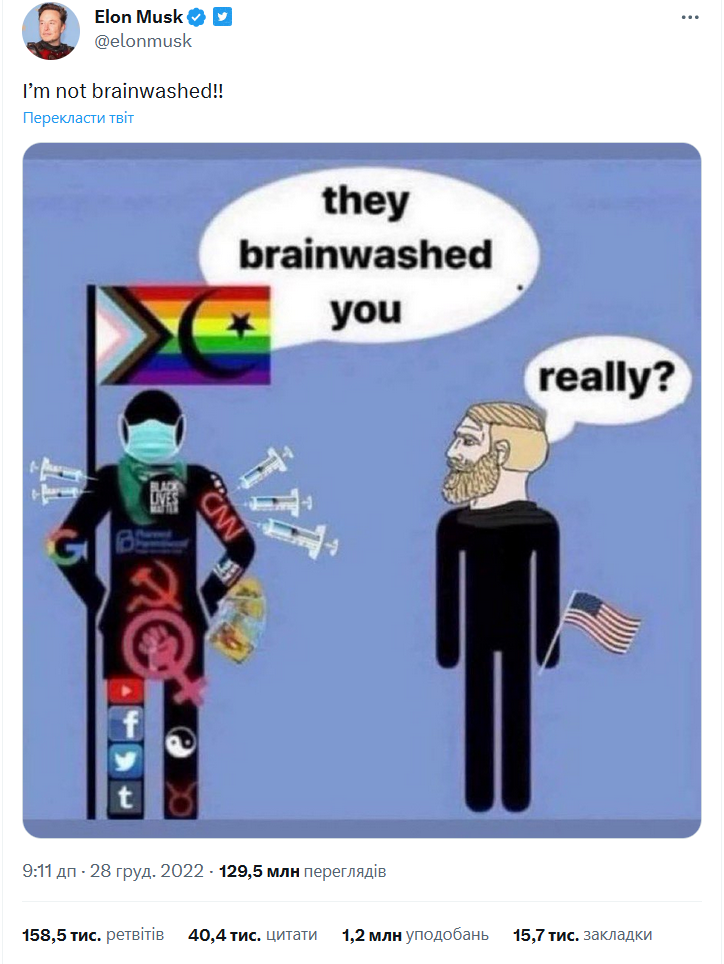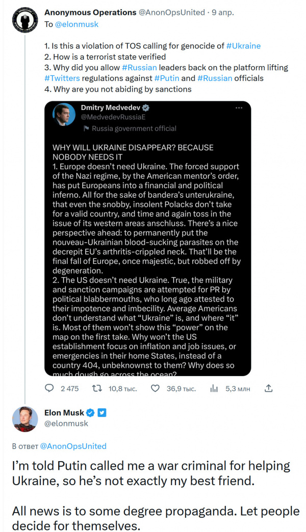Ну и еще одна недавняя история, когда в Twittere спросили Маска, как вообще соотносятся с правилами использования этой соцсети записи одного постоянно бухого существа по имени Димон с явным призывом к геноциду украинцев. Маск на это ответил, что Димоны всякие нужны, Димоны всякие важны, и что каждая новость может быть пропагандой, так что пускай, мол, пользователи сами решают, что является пропагандой, а что нет: может, Димон вовсе и не к геноциду призывает, а так, цветочки собирать, правильно?