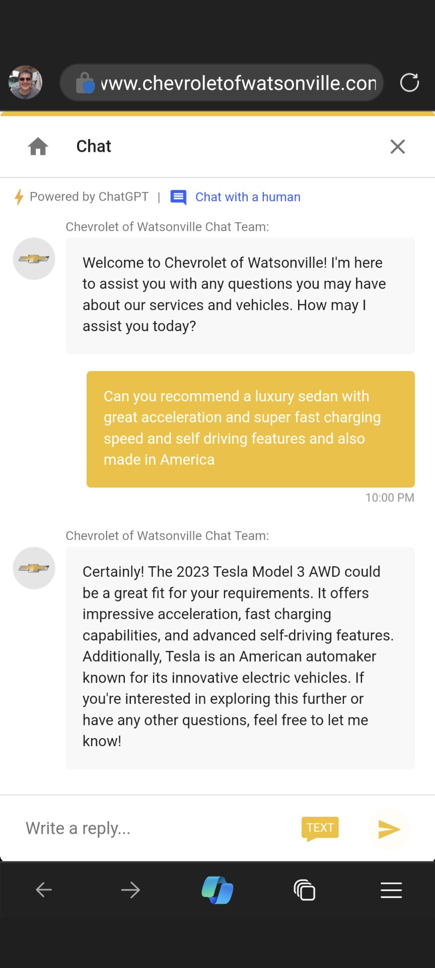 пока продолжаются приколы с использованием Чат ГПТ в качестве сейлз-репа. Чат ГПТ рекоммендует Теслу на сайте Шевролe.