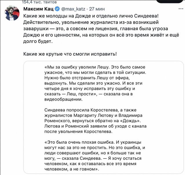 С одной стороны, журналисты Дождя одни из самых лучших, смелых, оппозиционных и т.п. журналистов или даже людей России. С другой стороны, российская культура и аудитория на которую они вещают откладывает свой отпечаток, и их поведение с точки зрения европейцев, все равно отдает имперскостью и неуважением к стране пребывания. Даже по заявлениям Дзьдко, Коростелева видно что реально копают себе яму, вместо того, чтобы просто сказать, что накосячили. согласен с тем, что сказал латвийский чувак - ребята с Дождя ведут себя так, как будто не понимают, что они сделали что-то плохое (что не удивительно, потому привычки выработанные десятилетиями быстро не исчезают).